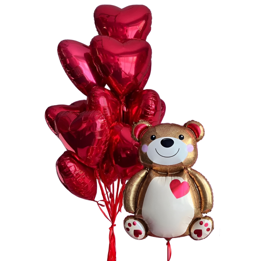 Η σύνθεση περιλαμβάνει 12 μπαλόνια (11 κόκκινες καρδιές foil και 1 foil μπαλόνι αρκουδάκι ) όλα φουσκωμένα με ήλιο ώστε να αιωρούνται με κορδέλες και βαρίδιο.