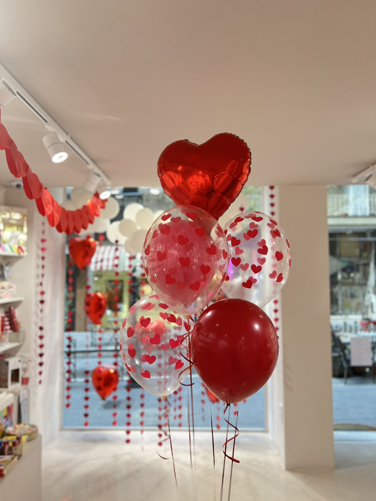 Each bouquet includes 6 balloons (1 red foil heart, 3 clear latex balloons with printed red hearts and 2 latex balloons in red) all filled with helium so that they float.